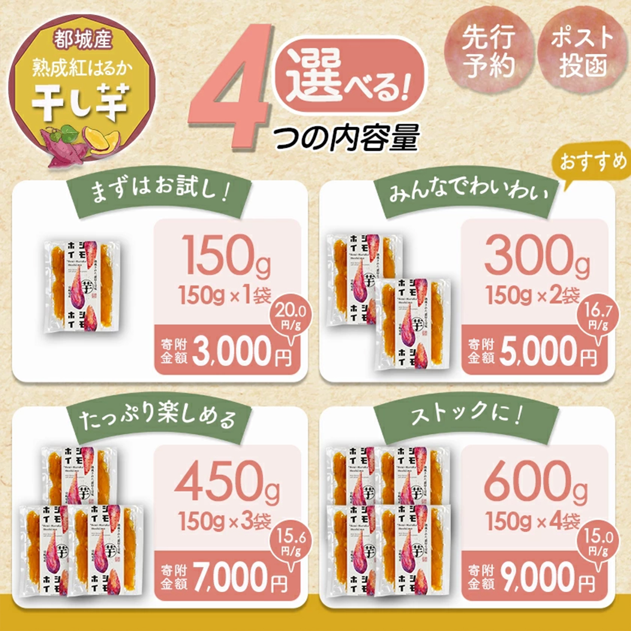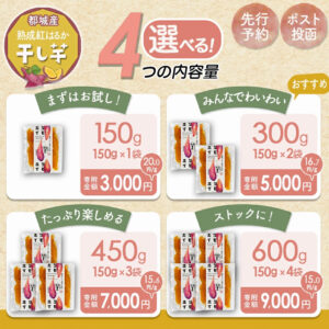 ふるさと納税 干し芋 150g(1袋) 干し芋 300g(150g×2袋) 干し芋 450g(150g×3袋) 干し芋 600g(150g×4袋) 紅はるか 1kg 紅はるか 3kg 紅はるか 5kg 全商品を見る 公式オンラインショップ 都城市ふるさと納税特設サイト 都城市楽天ふるさと納税 都城市さとふる よくある質問 お問い合わせ インスタグラム フェイスブック ツイッター 6 価格 ¥ (税込) 送料無料 最短2~7日営業日で発送(定休日を除く) YAHOO!ショッピングで購入 BASEで購入 STORESで購入